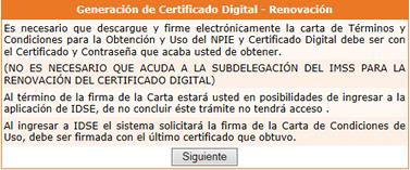 El certificado digital del IMSS, que se utiliza para acceder a la plataforma digital IMSS Desde Su Empresa (IDSE) tiene una vigencia de dos años, y puede ser renovado a través de Internet, evitando así tener que acudir personalmente a la delegación.